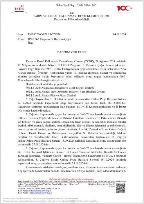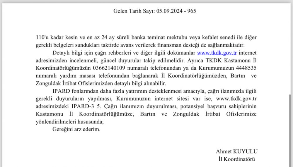 IPARD fonlarından daha fazla yatırımın desteklenmesi amacıyla, çağrı ilanımızla ilgili gerekli duyuruların yapılması, Kurumunuzun internet sitesi var ise, www.tkdk.gov.tr adresimizdeki IPARD-3 5. Çağrı ilanımızın duyurulması, potansiyel başvuru sahiplerinin Kastamonu İl Koordinatörlüğümüze, Bartın ve Zonguldak İrtibat Ofislerimize yönlendirilmeleri hususunda;