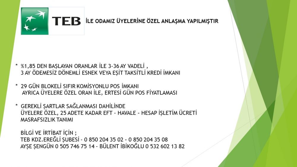 Kdz Ereğli Ticaret ve Sanayi Odası ile Türk Ekonomi Bankası (TEB) arasında, odamız üyelerine yönelik avantajlı kredi sağlamak üzere anlaşma imzalandı.Kdz Ereğli Ticaret ve Sanayi Odası ile Türk Ekonomi Bankası (TEB) arasında, odamız üyelerine yönelik avantajlı kredi sağlamak üzere anlaşma imzalandı.
