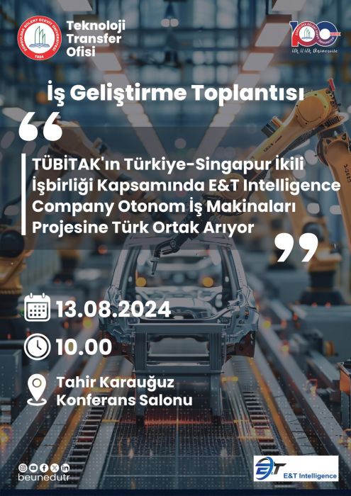 TÜBİTAK'ın Türkiye-Singapur ikili iş birliği kapsamında E&T Intelligence Company Otonom İş Makineleri Projesine Türk ortak arıyorTÜBİTAK'ın Türkiye-Singapur İkili İş Birliği kapsamında E&T Intelligence Company Otonom İş Makineleri Projesine Türk ortak arıyor. 13.08.2024 tarihi saat 10.00'da Tahir Karauğuz Konferans Salonu'nda yapılacak olan iş geliştirme toplantısına İş Birliği kapsamında Türk ortaklar katılım sağlayacak.