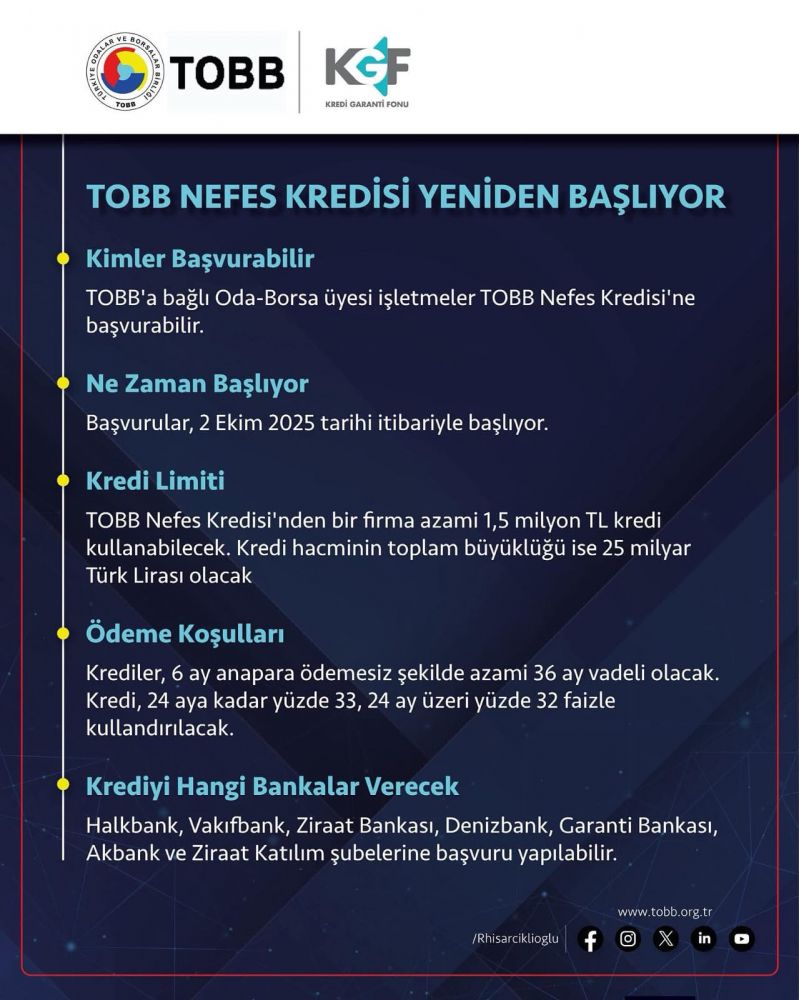 KOBİ’lere uygun koşullarda finansman desteği sağlamak amacıyla yeni bir TOBB Nefes Kredisi’ni hayata geçiriyoruz.