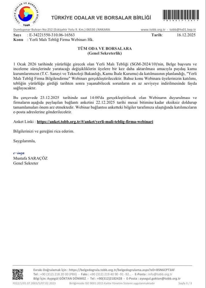 Yerli Malı Tebliğ Firma Webinarı Hk.